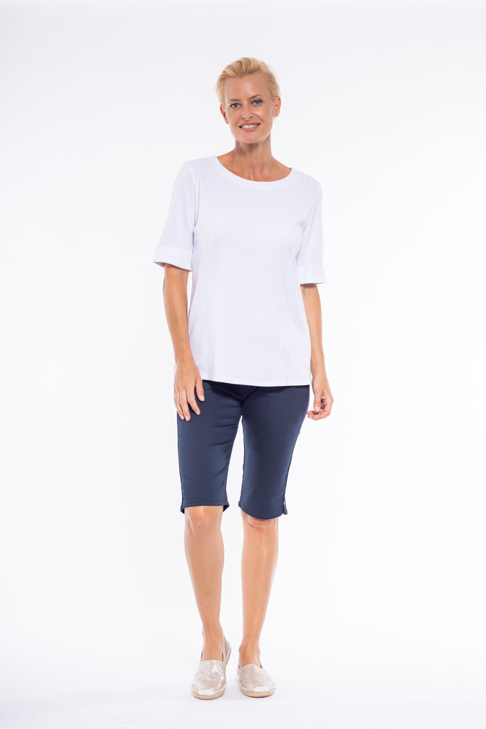 The Mid Sleeve Tee by Café Latte in White is a stylish and versatile option for those who want a classic piece with a bit of extra flair.