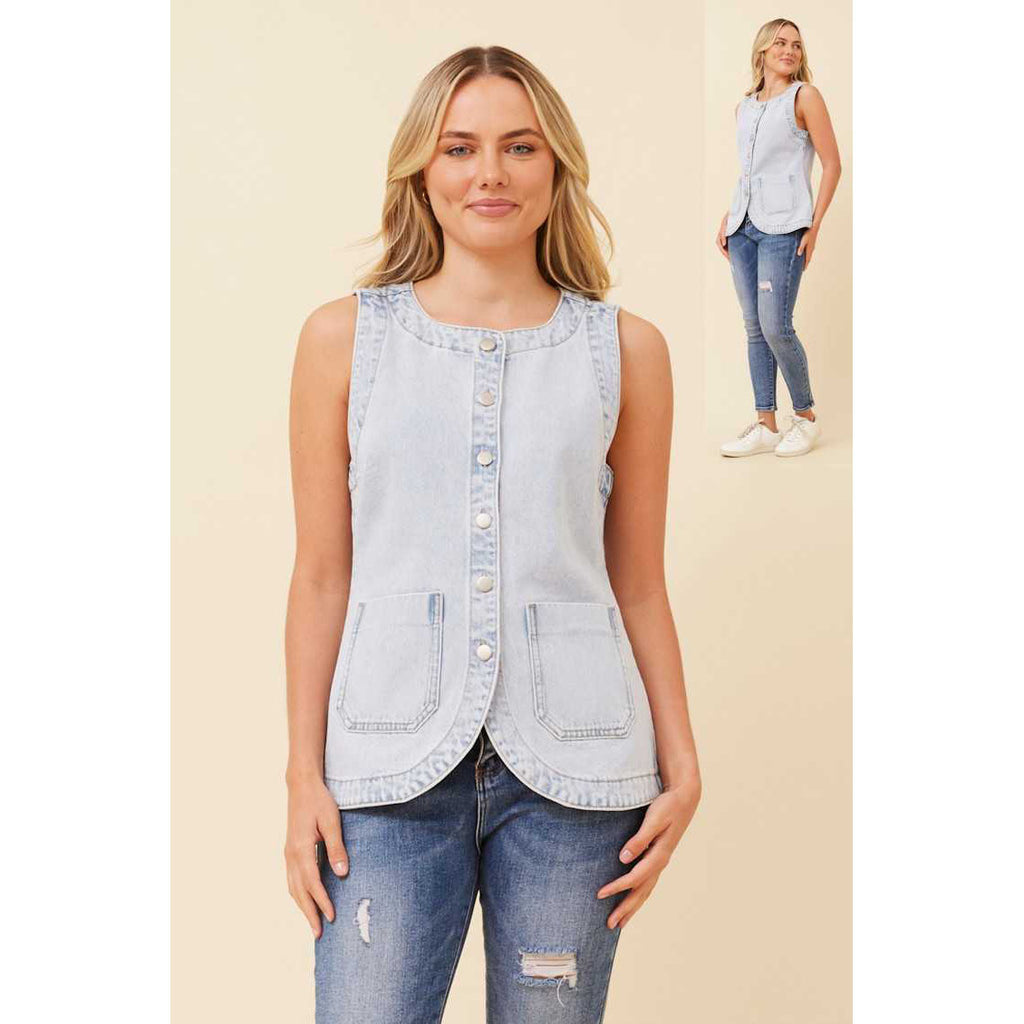 The vest is a versatile and stylish layering piece for any wardrobe. With its classic denim design, it adds an edgy touch to any outfit. This vest pairs perfectly with jeans, skirts, or shorts for an effortlessly chic look.
