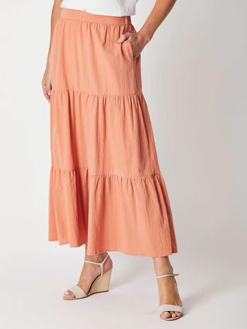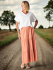 The Prudence Upcycle Skirt is a maxi-length style featuring side pockets, an elasticated waistband for added comfort with a flat front panel, and a beautiful amount of swing! Crafted from 100% upcycled cotton in a beautifully earthy peach-terracotta tone.