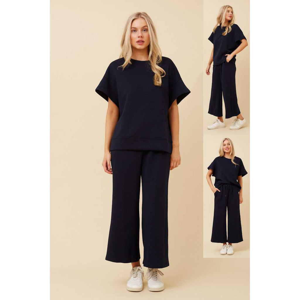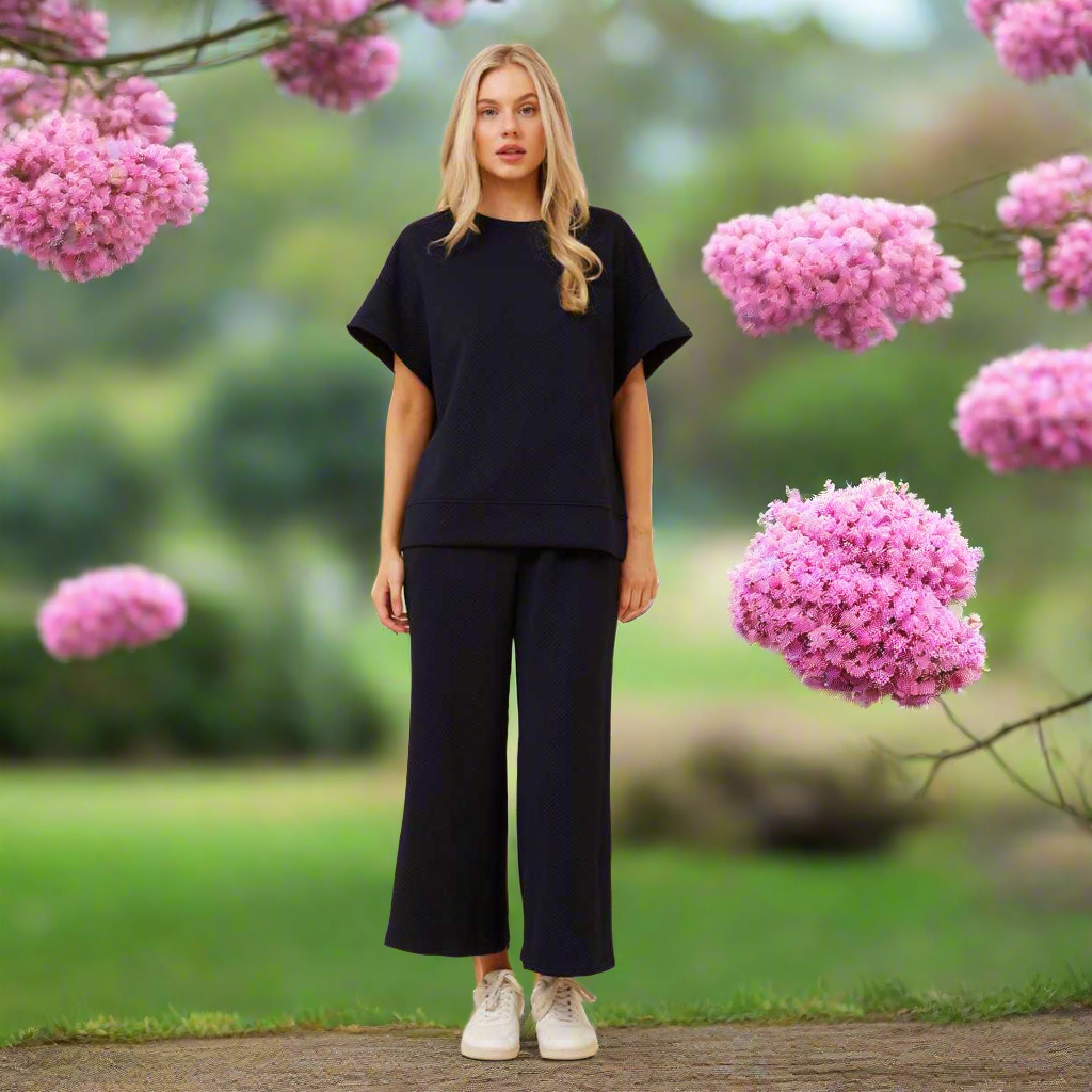 Owe Set is your new go-to for style and comfort, featuring a perfectly coordinated top and pants ensemble. Pair with sneakers or sandals for a laid-back look.
