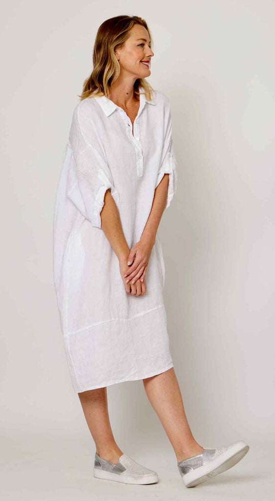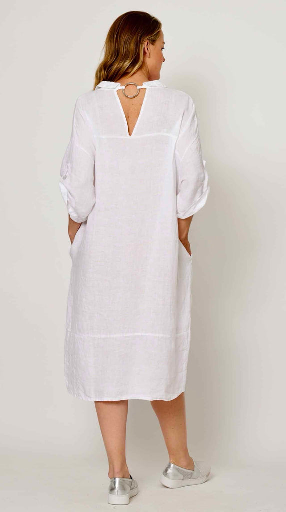 This white linen dress strikes the perfect balance between relaxed and refined. Made from 100% pure linen, it's naturally breathable and comfortable for everyday wear. The front button-down design lets you adjust the neckline to suit your mood, while the metal ring accent at the back adds an understated edge. Throw it on with sneakers for casual outings or pair it with simple jewellery for a more polished look—versatility that works season after season.