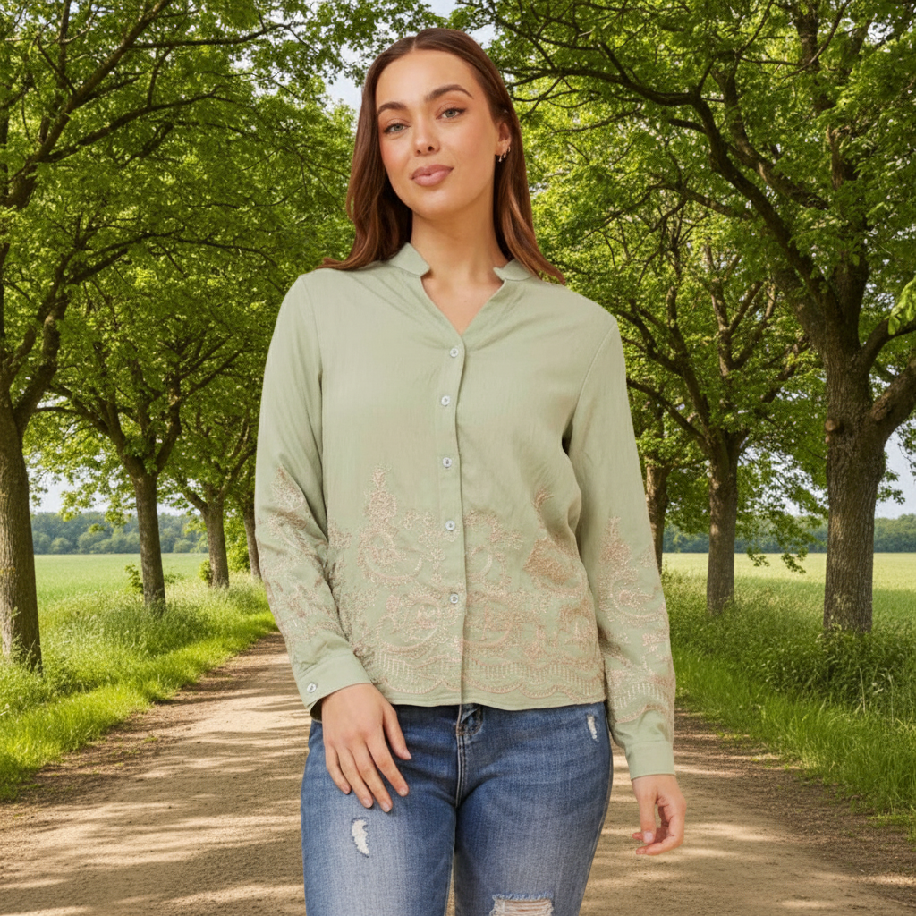 Elevate your everyday wardrobe with this refined button-through shirt in soft sage. Delicate embroidery detailing adds understated elegance, making it equally suited to casual styling or layered under tailored pieces. The classic silhouette and versatile colour ensure effortless coordination with your existing collection. A timeless investment piece that transcends seasons.